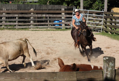 Hier lässt sich die Entwicklung am ersten Tag gut erkennen: Erst Neugierde gepaart mit Unsicherheit, dann Neugierde. Unterstützt von einer erfahrenen Stute (QT Poco Streeke, mare) wandelt sich die Neugierde zu der am Rind gewollten Agression. Am Ende der Einheit hat Smoky (QT Shes a fighter) begonnen, selbstständig am Rind zu bleiben und es entwickelte sich von alleine mehr Dynamik. Nun muss sie lernen, die Aufgabe in Zusammenarbeit mit ihrem Reiter anzugehen. Die Agression muss kontrolliert genutzt werden.